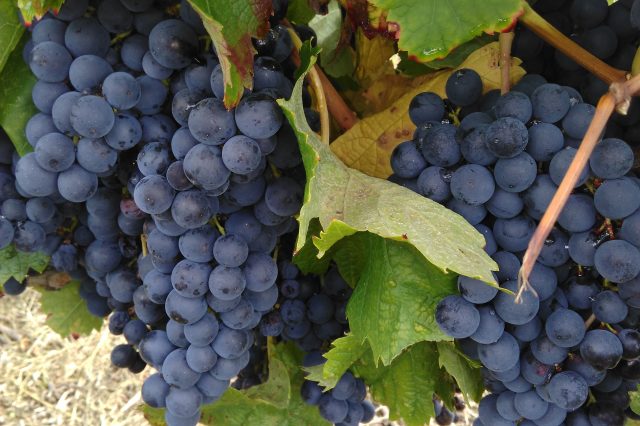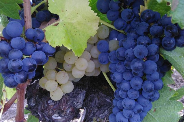 Une petite note qui donne le sourire: cette photo d’un pied de vigne mi-rouge mi-blanc! Une trace de nos anciens qui remplaçaient les pieds morts avec ce qu’ils avaient, sans toujours savoir ce qu’ils avaient. Ici, un pied de merlot voisin d’un pied de sémillon, où les grappes s’entremêlent laissant penser à un pied mi-rouge mi-blanc. Vendangé à la main, une fois n’est pas coutume!
