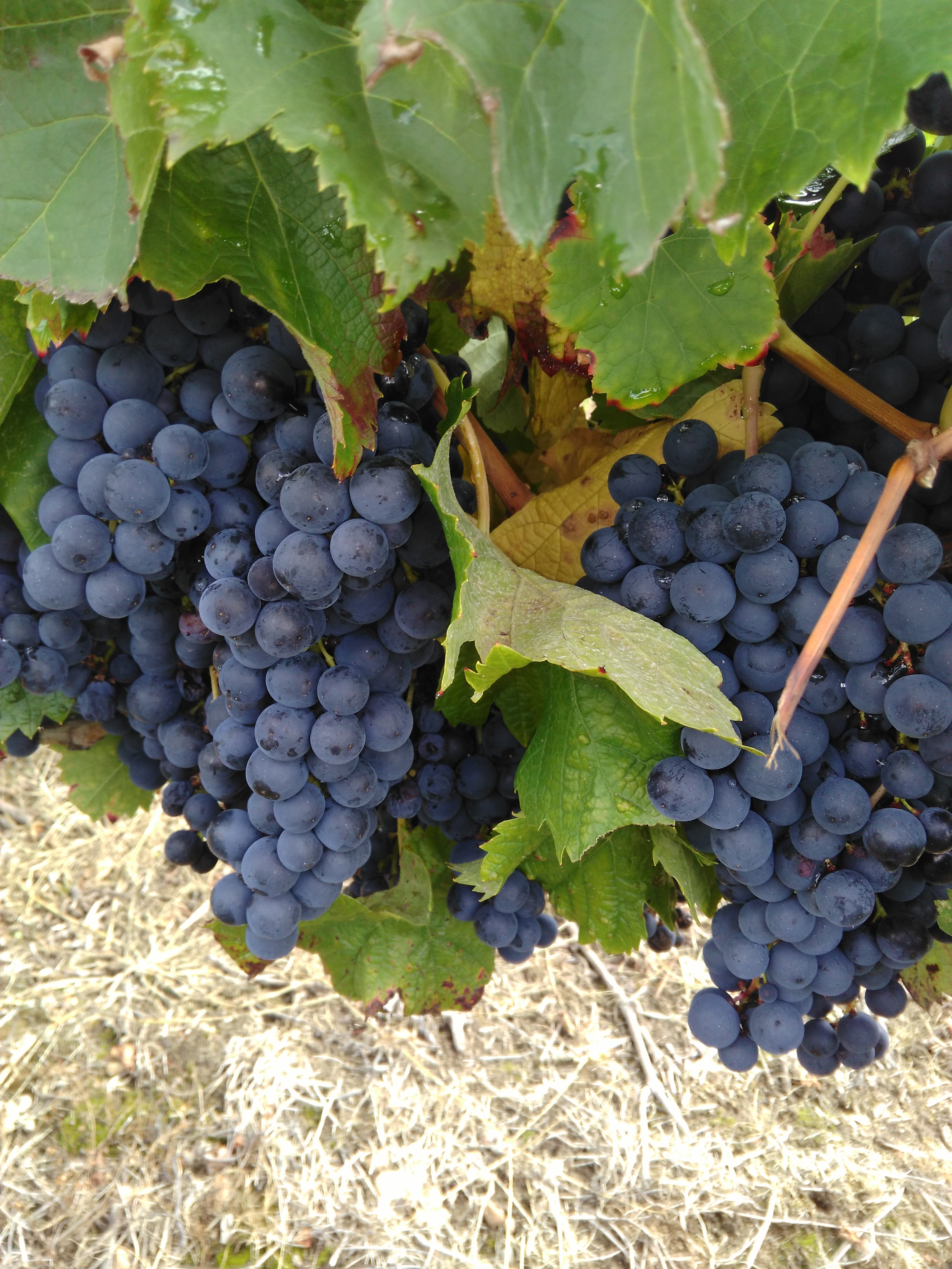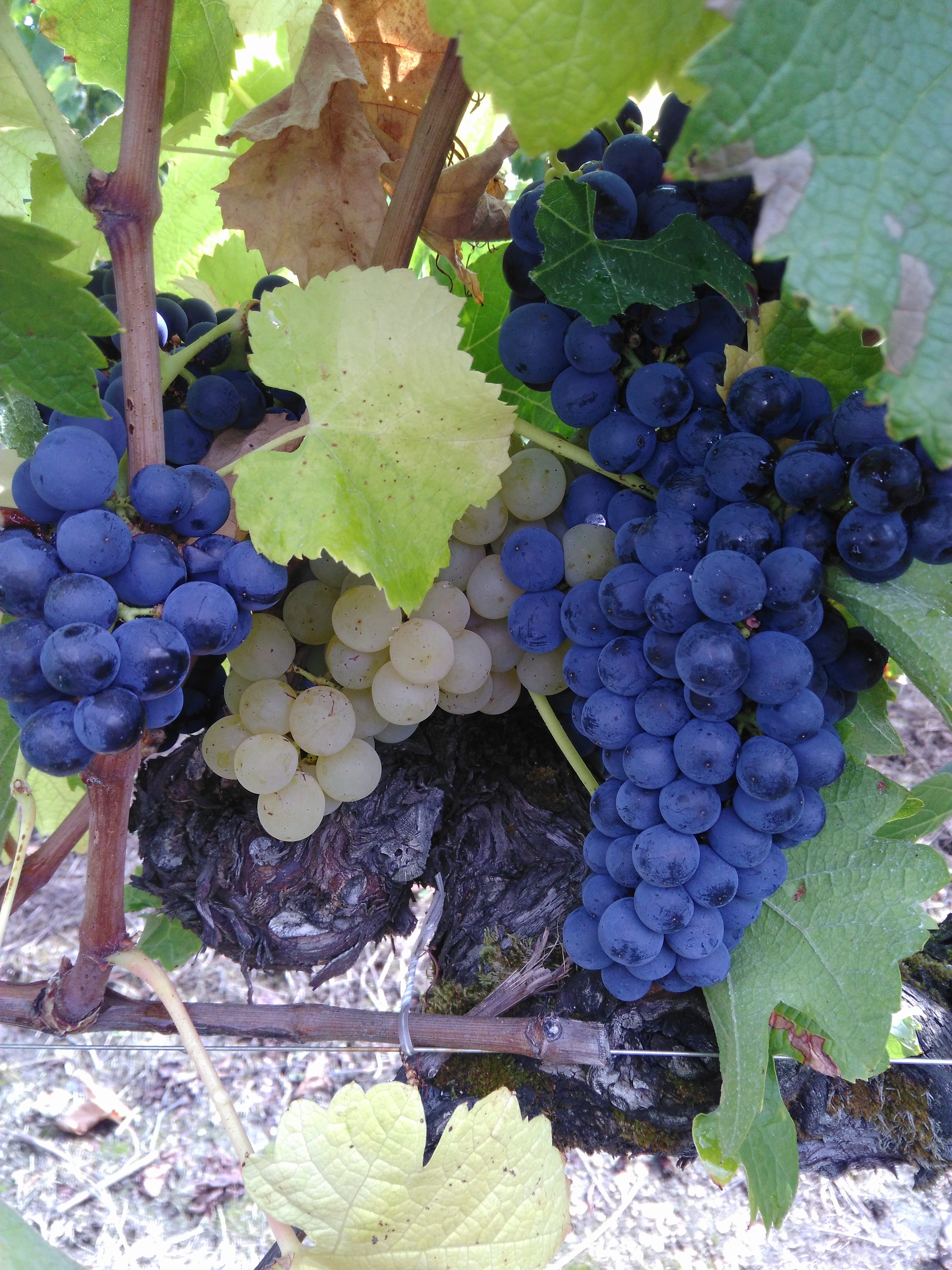 Une petite note qui donne le sourire: cette photo d’un pied de vigne mi-rouge mi-blanc! Une trace de nos anciens qui remplaçaient les pieds morts avec ce qu’ils avaient, sans toujours savoir ce qu’ils avaient. Ici, un pied de merlot voisin d’un pied de sémillon, où les grappes s’entremêlent laissant penser à un pied mi-rouge mi-blanc. Vendangé à la main, une fois n’est pas coutume!
